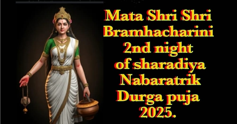 She is two-armed and full of blazing light. Mother Brahmacharini stands upright, holding a japa mala (rosary) in her right hand and a kamandalu (water pot) in her left. If you can please the Mother by worshiping this form on the second night of Navratri, the sadhak’s wishes are fulfilled by the Mother’s grace, and women get their desired husband. So, the worship of this form of the Mother is very important for women. However, it is also true that if a woman is unable to perform the complete puja, i.e., the nine forms of Navadurga, she can still get her wishes fulfilled by being present at the puja of Mother Shri Shri Brahmacharini, participating in this puja, and pleasing the Mother.