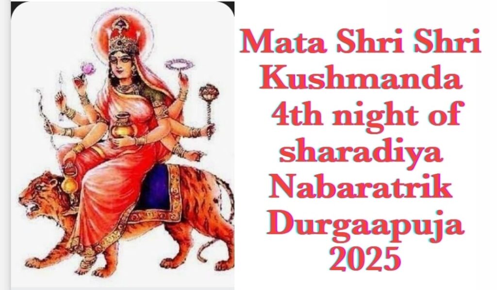 The fourth form of Navadurga is Mother Shri Shri Kushmanda. Before creation, when the Earth was covered in darkness, Mother Shri Shri Kushmanda created the universe and lit it up with a gentle smile. Her body is as radiant as the sun, and the energy emanating from her body is transmitted to every living being in the universe. The goddess is eight-armed and holds a mace, discus, lotus, kamandalu, arrow, bow, a pitcher full of nectar, and a rosary that grants sidhhis. She is seated on a tiger. During the puja of this form of the Mother, it is essential to offer fried or curried pumpkin as her prasad, as it is the Mother’s favorite food, and she is extremely pleased with it. During the puja of Mother Shri Shri Kushmanda on the fourth night of Navratri, if flowers, durba grass, sandalwood, and cooked rice are offered to the best of one’s ability, the Mother is extremely pleased and blesses the sadhak or sadhika with the destruction of diseases and sorrows, as well as an increase in fame and income.