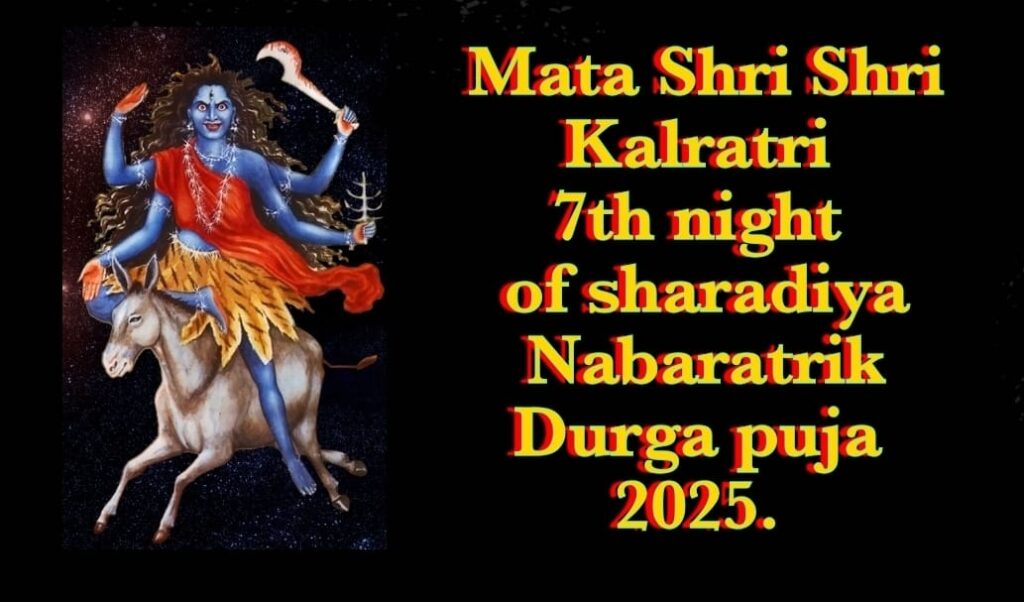 The seventh form of Navadurga is Kalratri. Here, the Mother has a completely black complexion, wears a tiger skin, has a terrible form, has rough hair, a garland as bright as a lightning flash around her neck, and emits terrible fire with her breath. She is seated on a donkey and is four-armed. Her two right hands are in the Abhayamudra and Varadamudra, and her two left hands hold a sword and an iron spike, respectively. On the seventh night of Navratri, by worshiping this form of the Mother with reverence, devotion, faith, sincerity, purity, and single-mindedness, the devotee is freed from all planetary obstacles and all enemies are destroyed. In times of danger or in front of an enemy, just by remembering the Mother with reverence, devotion, and faith, the enemy, no matter how powerful, is immediately forced to flee.