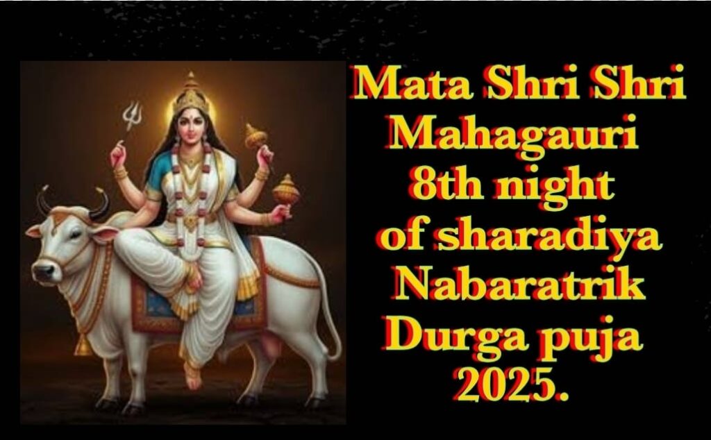 The eighth form of Navadurga is Mother Shri Shri Mahagauri. To regain Devadidev Mahadev or Shiva as her husband, Devi Mahagauri performed such severe penance that she became black. But after Mahadev was pleased and accepted her as his wife, Mother Shri Shri Mahagauri became as white and bright as a conch or the moon after bathing in the holy water of the Ganga. She is seated on a bull, is of white complexion, wears white clothes, and is adorned with various ornaments. Mother Shri Shri Mahagauri is four-armed. Her two right hands are in the Abhayamudra and hold a rosary, and her two left hands hold a kamandalu and a trident, respectively. On the eighth night of Navratri, by pleasing the Mother by worshiping Mother Shri Shri Mahagauri, the sadhak or sadhika can easily acquire the immense power to control any person, and wives can control their own husbands.