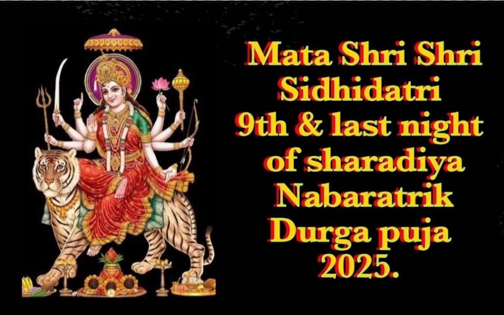 The ninth and last form of Navadurga is Mother Shri Shri Siddhidatri. According to the Puranas, Devadidev Mahadev or Shiva himself attained siddhi (perfection) by the grace of the goddess and became Ardhanarishwar (half male, half female) because of her favor. Here, the goddess is seated on a tiger, is eight-armed, and is adorned with a conch, lotus, mace, discus, sword, trident, and bow-arrow. But she is in the Abhayamudra. According to another belief, she is four-armed and seated on a lotus. After pleasing the Mother by worshiping Mother Shri Shri Siddhidatri on the ninth or last night of Navratri, no wish of the sadhak or sadhika in this world or the next remains unfulfilled. All their wishes are fulfilled by the Mother’s presence.